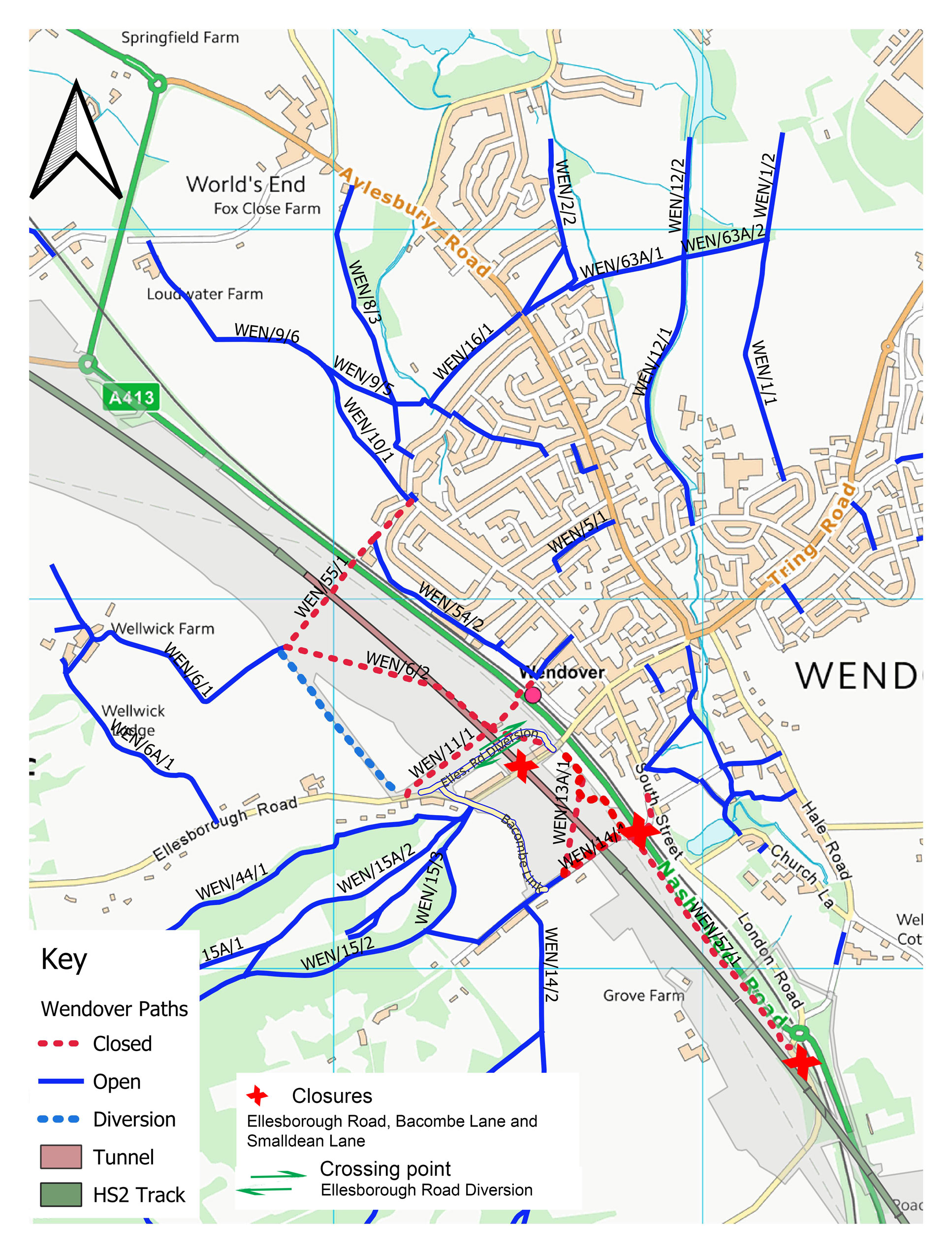 - Continue on the (old) Ellesborough Road, footpath WEN/6/2 has been diverted along the western works boundary fence